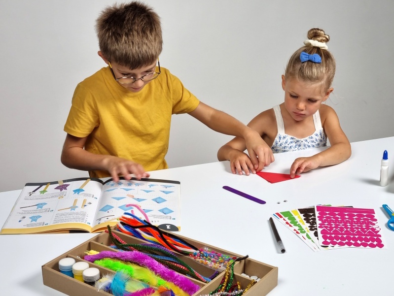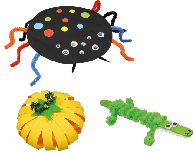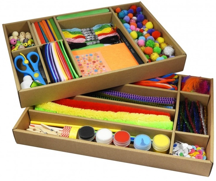 Что входит в набор: 5 баночек краски, 1 кисточка, 1 шило, 1 чёрный маркер, 1 дырокол, 1 ножницы, 1 тюбик клея, 2 тюбика клея с блёстками, 6 цветов ниток, 6 листов наклеек, 10 капс, 30 перьев, 25 пуговиц, 84 глазка, 100 пушистых проволочек, 125 палочек, 38 листов фетра, 5 листов гофрированной бумаги, 35 листов бумаги, бусины и помпоны, 2 лотка для хранения, 1 инструкция для 20 активностей.