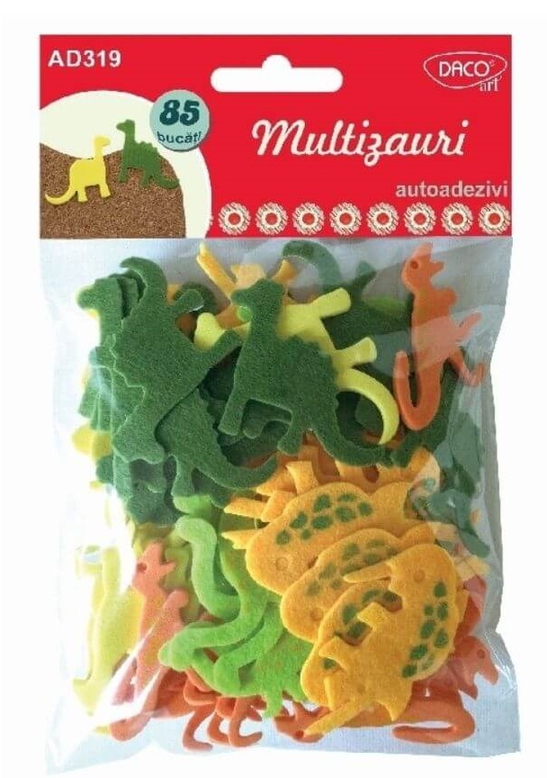 Набор содержит 85 предметов с 4 различными моделями динозавров из самоклеящейся пены и фетра разных размеров.