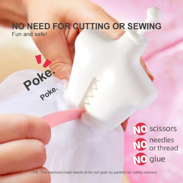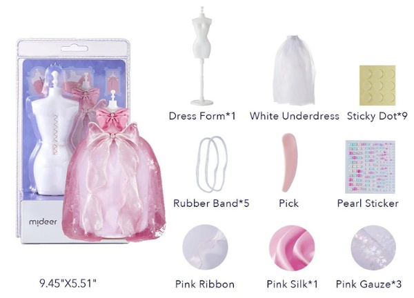 Комплектация1 манекен, 1 белое нижнее платье, 9 липких точек, 1 жемчужная наклейка, 5 резинок, 1 кисть, 1 розовый шелк, 3 розовых куска марли, 1 розовая лента