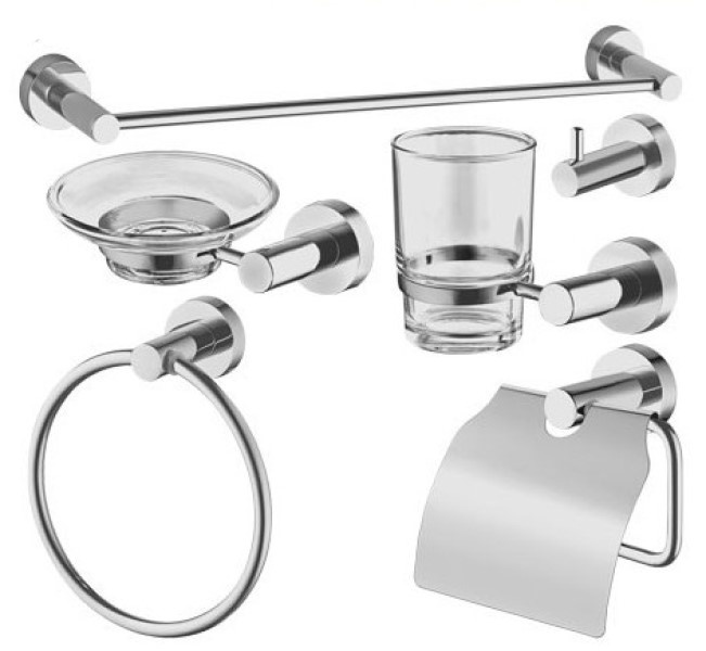 Особенности1 - крючок для халата, 1 - кольцо для полотенца, 1 - полотенцедержатель, 1 - держатель для туалетной бумаги с крышкой, 1 - мыльница с держателем, 1 - подстаканник с держателем