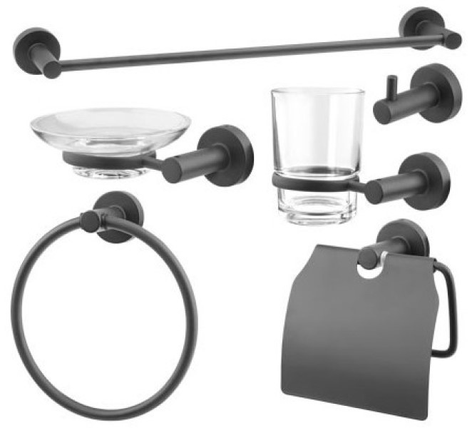 Особенности1 - крючок для халата, 1 - кольцо для полотенца, 1 - полотенцедержатель, 1 - держатель для туалетной бумаги с крышкой, 1 - мыльница с держателем, 1 - подстаканник с держателем