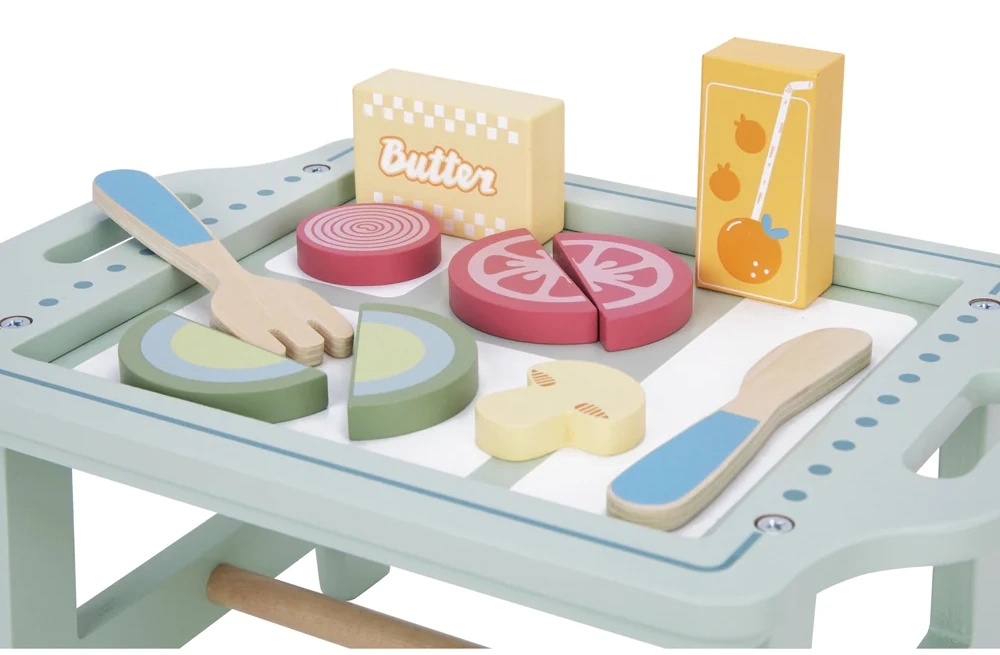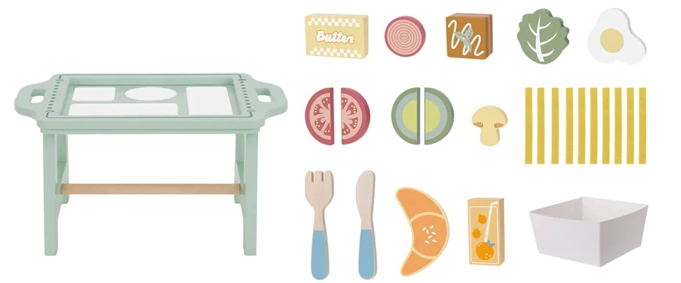 Игровой набор «Завтрак в постель» от Tooky Toy предлагает детям восхитительные и творческие игры. В этот очаровательный деревянный набор входит деревянный поднос с подставками, деревянные продукты, имитирующие вкусный завтрак, а также деревянная вилка и нож.
