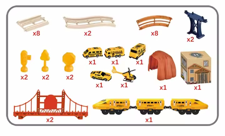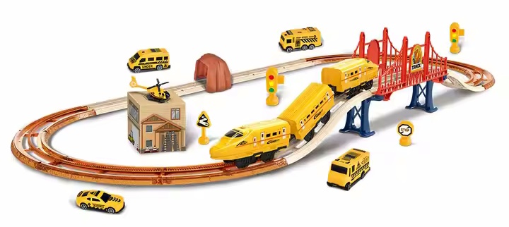 Очень захватывающий игровой набор, который позволит вам открыть для себя мир железнодорожных приключений. В набор входит множество элементов, таких как мосты, повороты и дорожные знаки, которые позволяют строить разнообразные и крутые дороги. В набор также входит поезд из двух вагонов, готовый отвезти вас в увлекательное путешествие по вашей собственной железной дороге. Локомотив работает от аккумуляторов, что обеспечивает долгие часы игры.