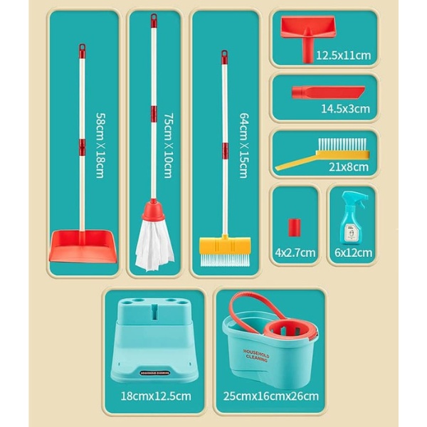 Набор для уборки — это яркий и реалистичный игровой комплект, который поможет вашим детям почувствовать себя настоящими помощниками по дому! В комплект входят 10 предметов, включая метлу, швабру, щетку, знак «Мокрый пол» и стойку для хранения — все выполнено в удобных детских размерах и из качественного дерева. Этот набор не только увлекательный, но и обучающий, позволяя детям развивать навыки уборки и поддержания чистоты.