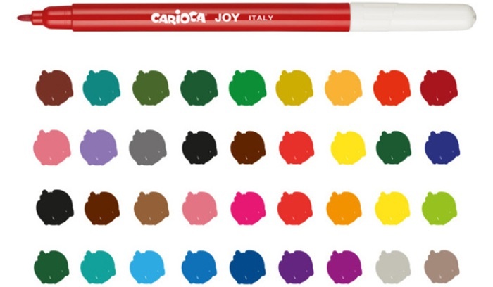 Набор «Carioca Joy» состоит из 36 разноцветных фломастеров, которые отлично подойдут и для школьных занятий, и просто для рисования. Фломастеры рисуют яркими насыщенными цветами. Чернила на водной основе легко смываются с кожи и отстирываются с большинства тканей. Корпус фломастеров изготовлен из полипропилена, а колпачок имеет специальные прорези, что обеспечивает вентилирование и еще больше увеличивает срок службы чернил и предотвращает их преждевременное высыхание.