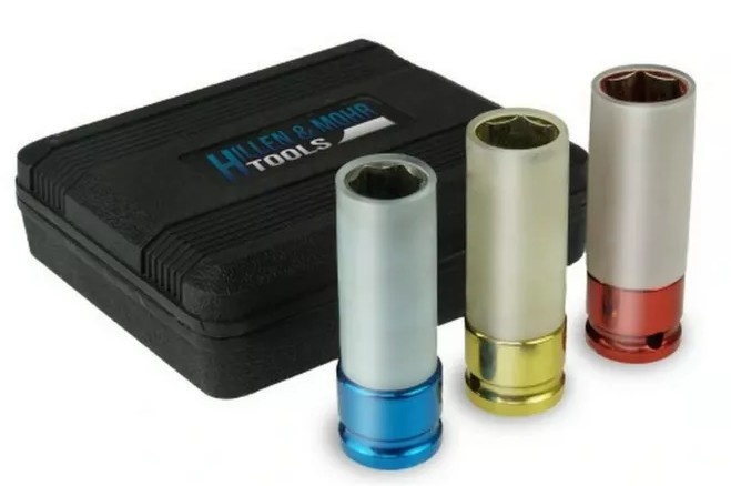Набор ударных торцевых головок Hillen&Mohr предназначен для работы с пневматическими гаечными ключами 1/2″ и используется для безопасного откручивания легкосплавных дисков. Инструменты изготовлены из высококачественной хромомолибденовой стали и снабжены защитной втулкой из мягкого пластика для защиты обода от повреждения лакокрасочного покрытия. Гнезда имеют длину 85 мм и хромированное покрытие трех цветов, что позволяет легко различать размеры 17, 19 или 21 мм.