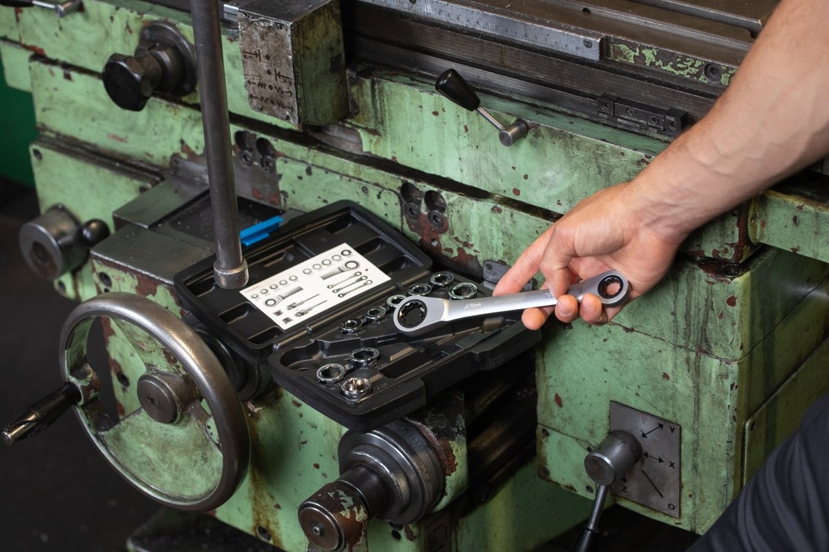 Ключ с трещоткой и шарниром служит для откручивания и закручивания резьбовых соединений с шести или двенадцатигранными крепежными элементами. Благодаря трещотке отсутствует необходимость перекладывания ключа, а насадки позволяют работать с болтами разных размеров. 11 элементов набора позволяют использование полного состава ключей размером 8-19мм. Универсальные возможности ключа позволяют его использовать как в мастерских, так и в ремонтно — строительных и монтажных работах.