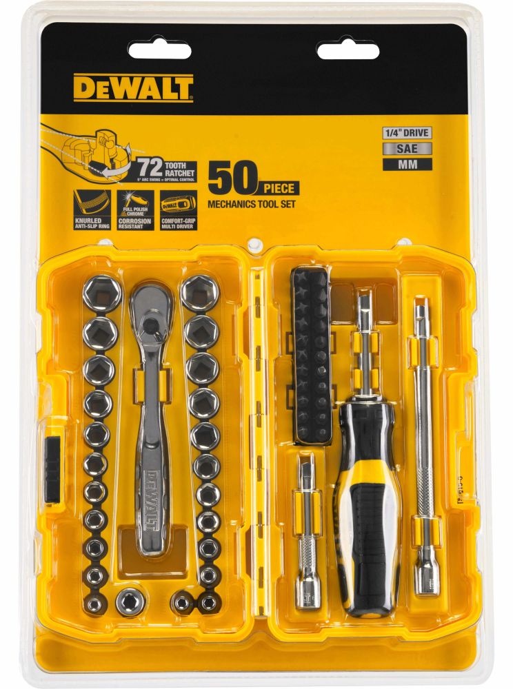 Набор оснастки DEWALT из 50 предметов включает в себя различные головки 1/4" и 22 биты в кейсе. Трещотка с 72 зубьями позволяет перемещаться по дуге в 5°, что облегчает маневрирование в ограниченном пространстве. Инструменты полностью хромированные и отполированы, что делает их устойчивыми к коррозии. Технология DIRECTORQUE обеспечивает лучший контакт с плоскими поверхностями крепежа, уменьшает изгибы и продлевает срок службы. В комплекте практичный и прочный кейс для удобства хранения.
