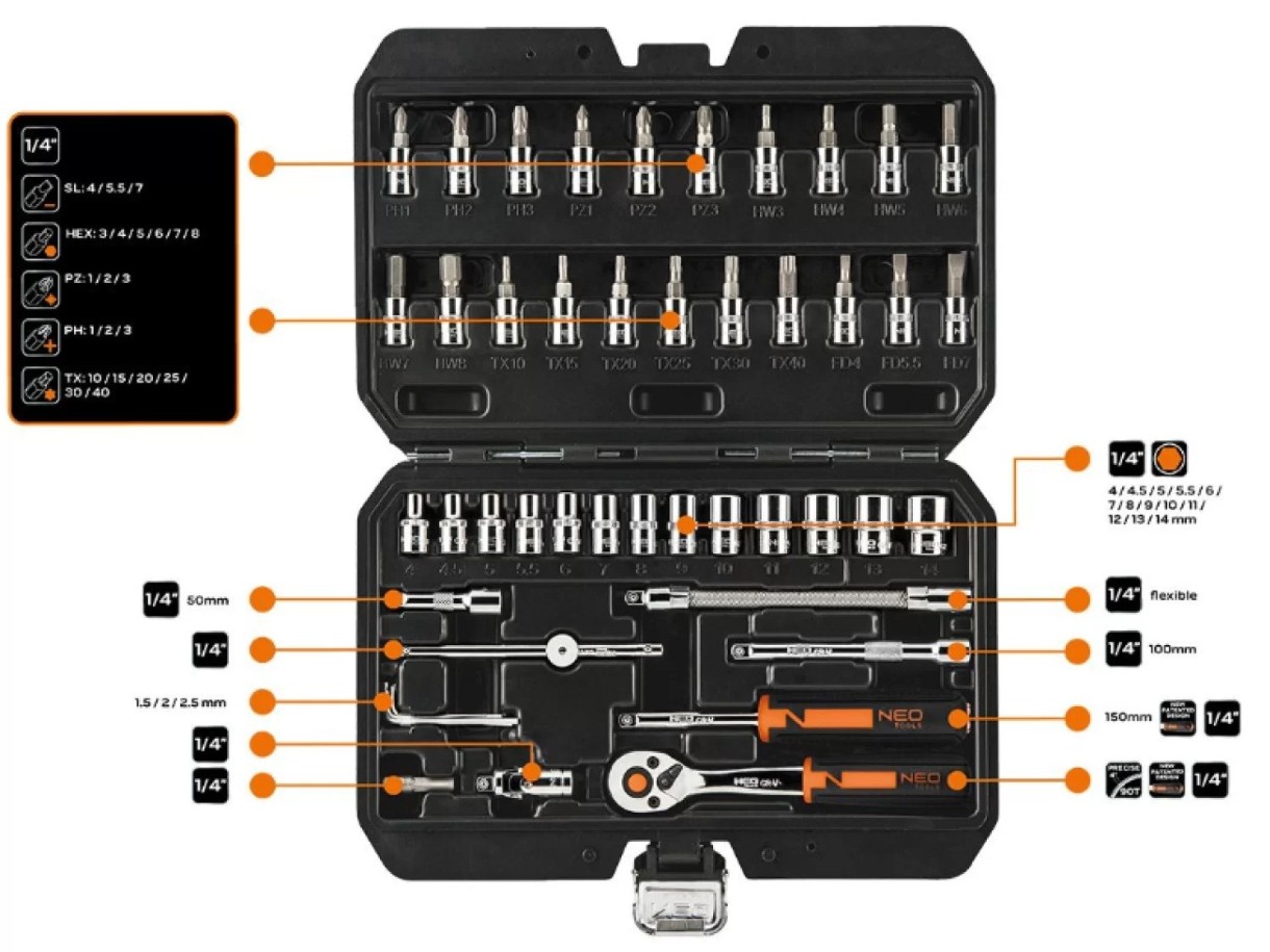 Набор торцевых головок Neo Tools 10-004, 1/4" состоит из 46 предметов изготовленных из высококачественной хромованадиевой стали (CrV).