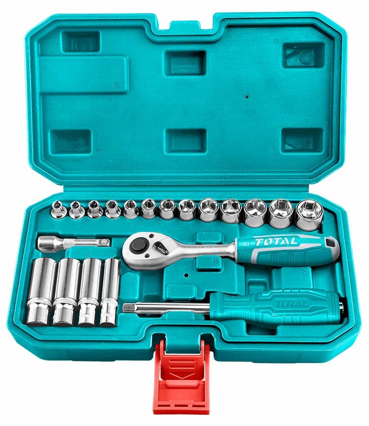 Набор инструмента, 1/2 20 предметов TOTAL THT141201 применяется для монтажных и демонтажных работ с резьбовыми соединениями. Посадочный квадрат - 1/4". Детали набора изготовлены из термообработанной хромванадиевой стали, поэтому способны выдерживать значительную нагрузку и отличаются износоустойчивостью. Рукоятка выполнена из материала с противоскользящими свойствами, имеет эргономичную форму. Набор поставляется в прочном пластиковом кейсе, благодаря чему обеспечивается бережная транспортировка и аккуратное хранение инструмента.