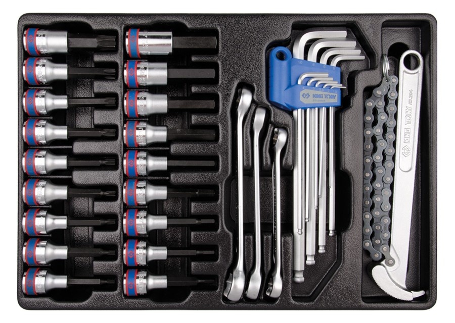 Набор включает в себя инструменты для работы с внутренним шестигранным профилем, а также профилем TORX. Входящие в состав разрезные ключи предназначены для работ с гайками, расположенными на трубках, длинных шпильках и т.п. Специальный цепной съёмник предназначен для работ по монтажу и демонтажу масляных фильтров. Материал ложемента – ПВХ (поливинилхлорид). Изготовлен специально для комплектации инструментальной тележки.