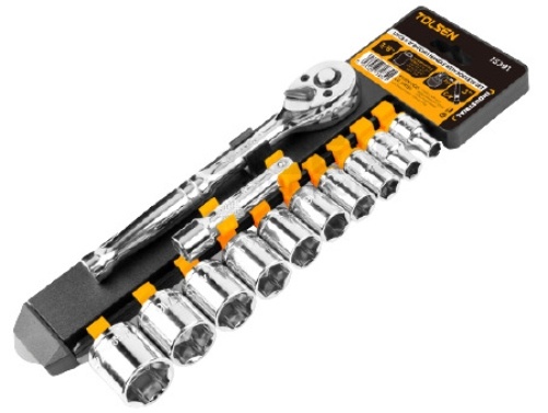 -Двухкомпонентная рукоятка с храповым механизмом: 72 зуба CrV -Головки CrV 10 шт.: 5/16″,3/8″,7/16″,1/2″,9/16″,5/8″,
