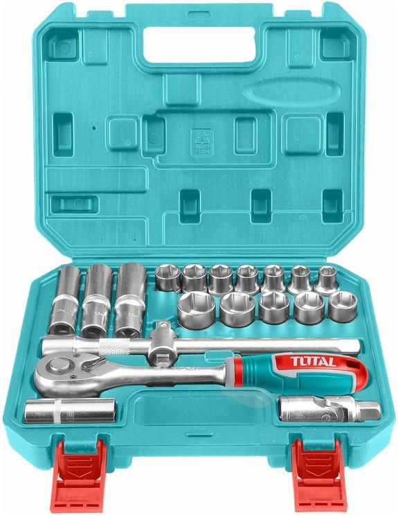 Набор инструмента, 1/2 20 предметов TOTAL THT121201 применяется для монтажных и демонтажных работ с резьбовыми соединениями. Посадочный квадрат - 1/2". Детали набора изготовлены из термообработанной хромванадиевой стали, поэтому способны выдерживать значительную нагрузку и отличаются износоустойчивостью. Рукоятка выполнена из материала с противоскользящими свойствами, имеет эргономичную форму. Набор поставляется в прочном пластиковом кейсе, благодаря чему обеспечивается бережная транспортировка и аккуратное хранение инструмента.
