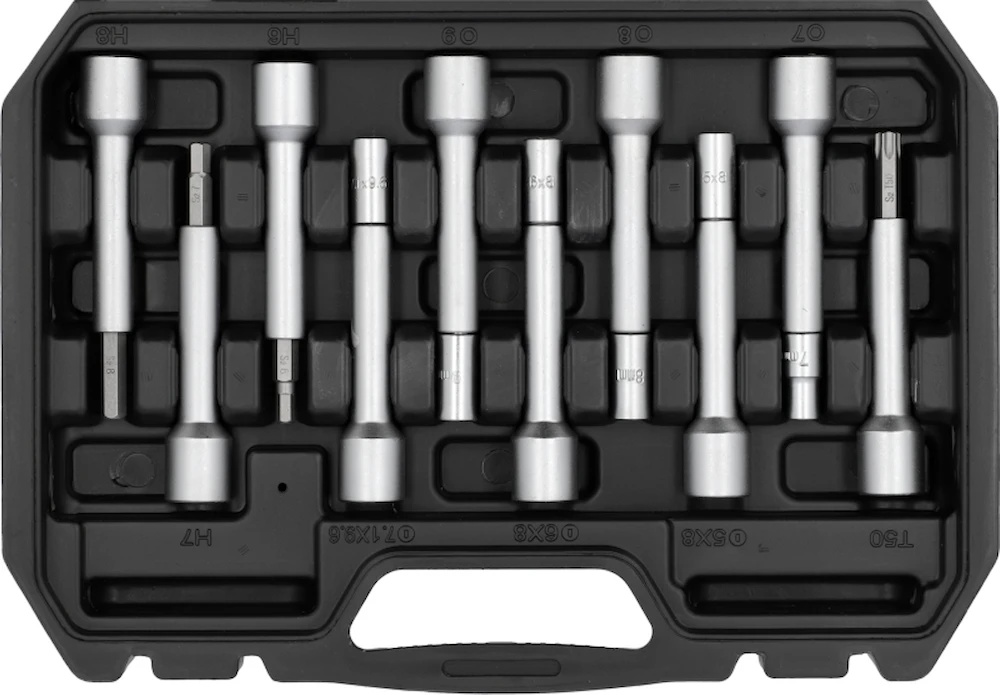 Набор из 19 головок для верхней части амортизатора специально разработан для установки и снятия амортизаторов. Он позволяет безопасно и точно откручивать и затягивать болты крепления стойки амортизатора, не повреждая их. Отличный выбор как для автомастерских, так и для автомехаников, работающих с подвеской легковых автомобилей.
