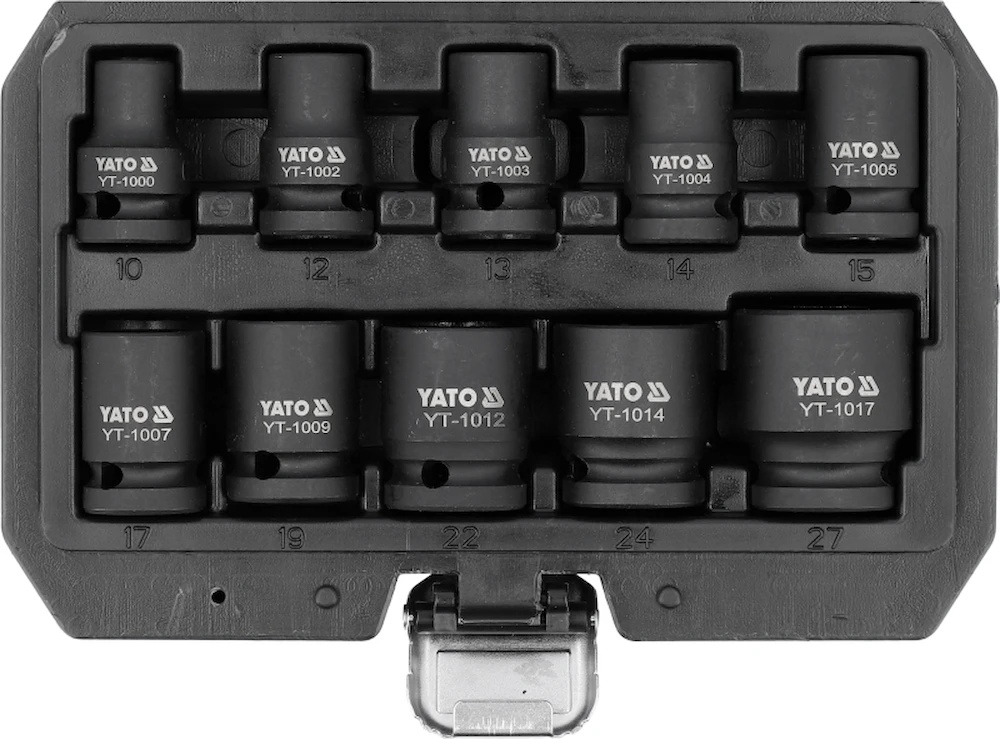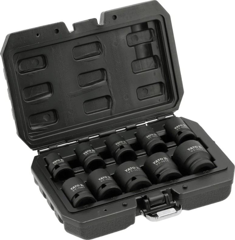 Yato YT-10252 — это набор ударных головок, который станет незаменимым помощником как для профессионалов, так и для любителей. В комплект входит десять бит различных размеров, включая 10, 12, 13, 14, 15, 17, 19, 22, 24 и 27 мм. Такой широкий диапазон позволяет работать с различными крепежами, обеспечивая универсальность и удобство в использовании. Кейс, в который упакованы головки, обеспечивает их надежное хранение и легкий доступ.