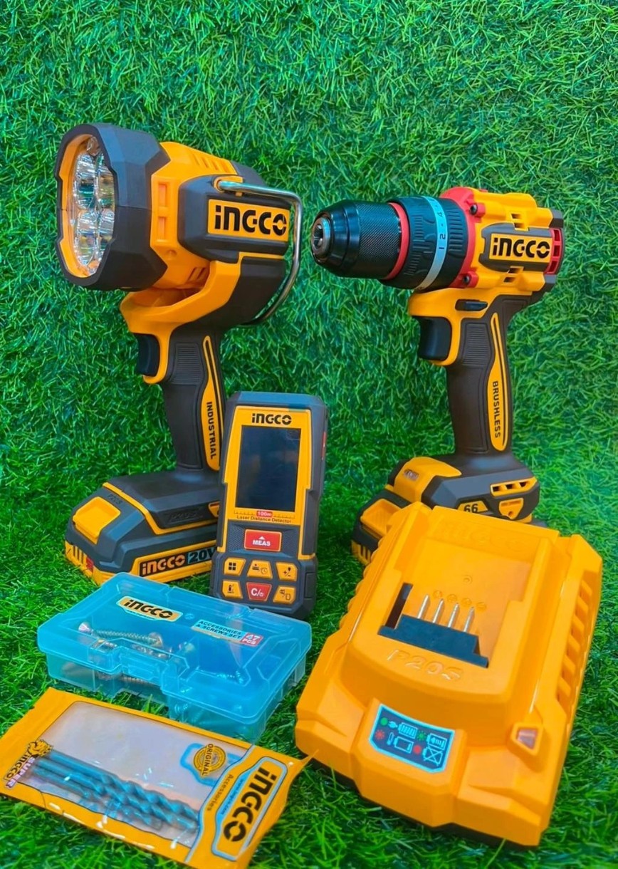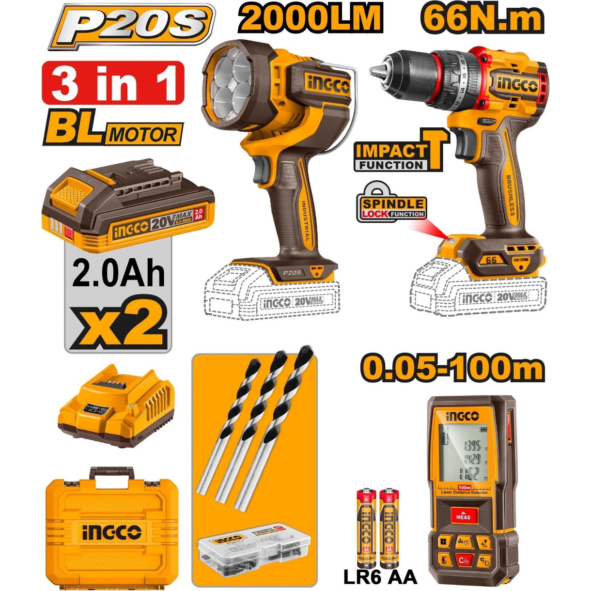 Набор из 3 беспроводных инструментов INGCO COSLI250885 20 В – сверление, измерение и освещение. Практичный и высокопроизводительный набор, идеально подходящий для профессиональной и домашней работы. Включает в себя бесщеточную ударную дрель, лазерный дальномер и светодиодный рабочий фонарь, все они питаются от платформы 20 В.