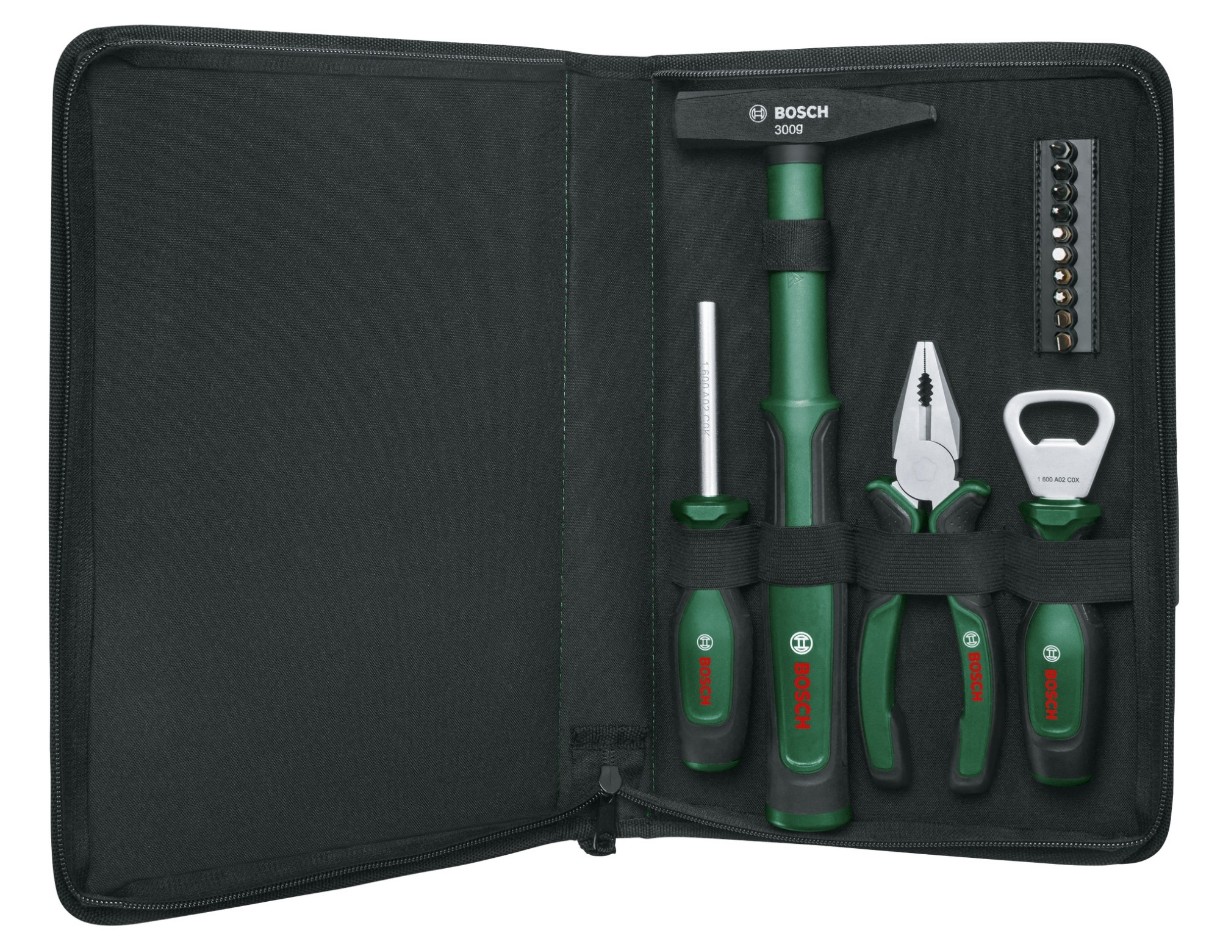 - Набор из 14 предметов: плоскогубцы, отвертка, молоток, открывалка для бутылок и аксессуары