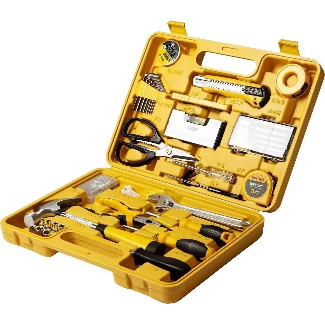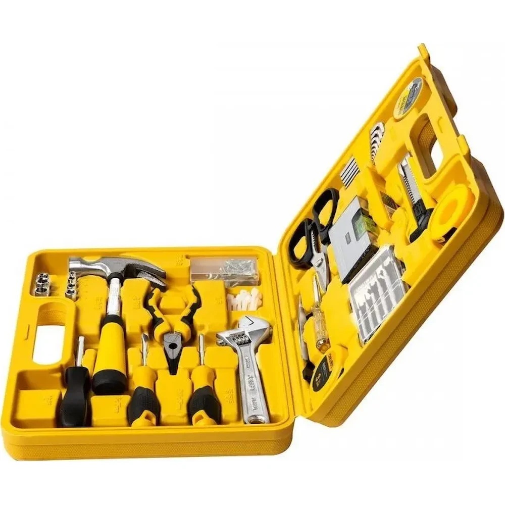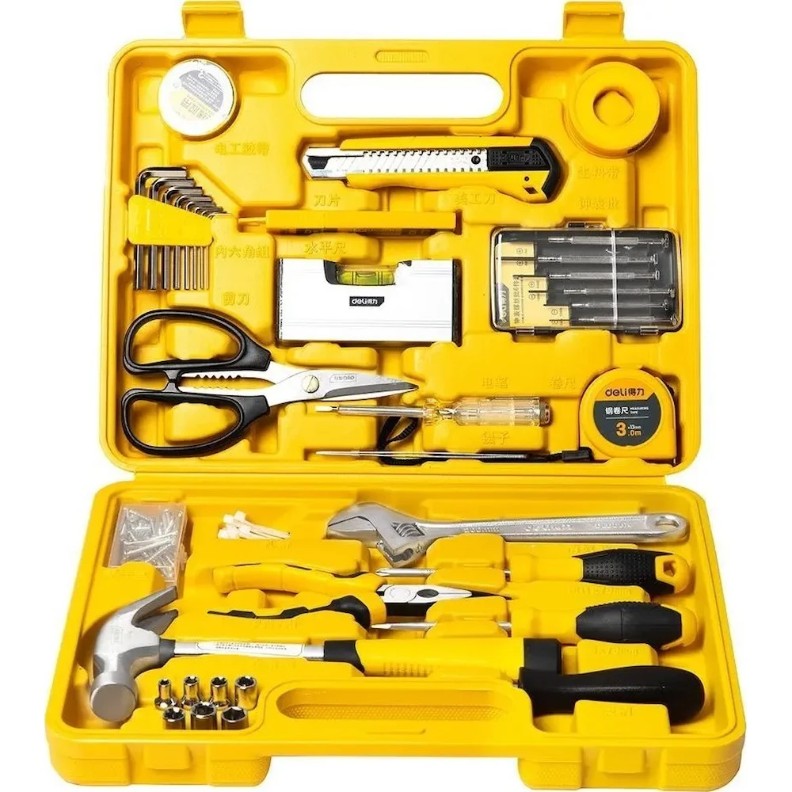 Набор инструментов Deli EDL1038J — это универсальный комплект из 38 предметов, предназначенный для бытового ремонта, сборки мебели и обслуживания электроники. Инструменты изготовлены из качественной стали с хромированным покрытием для защиты от коррозии и поставляются в прочном пластиковом кейсе желтого цвета.