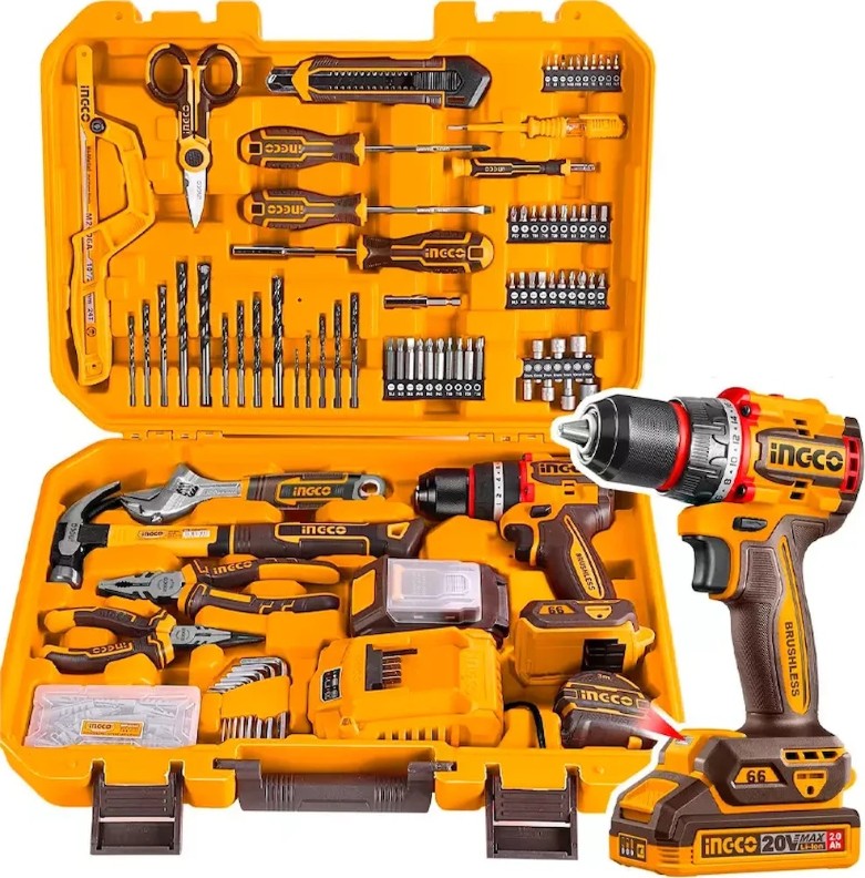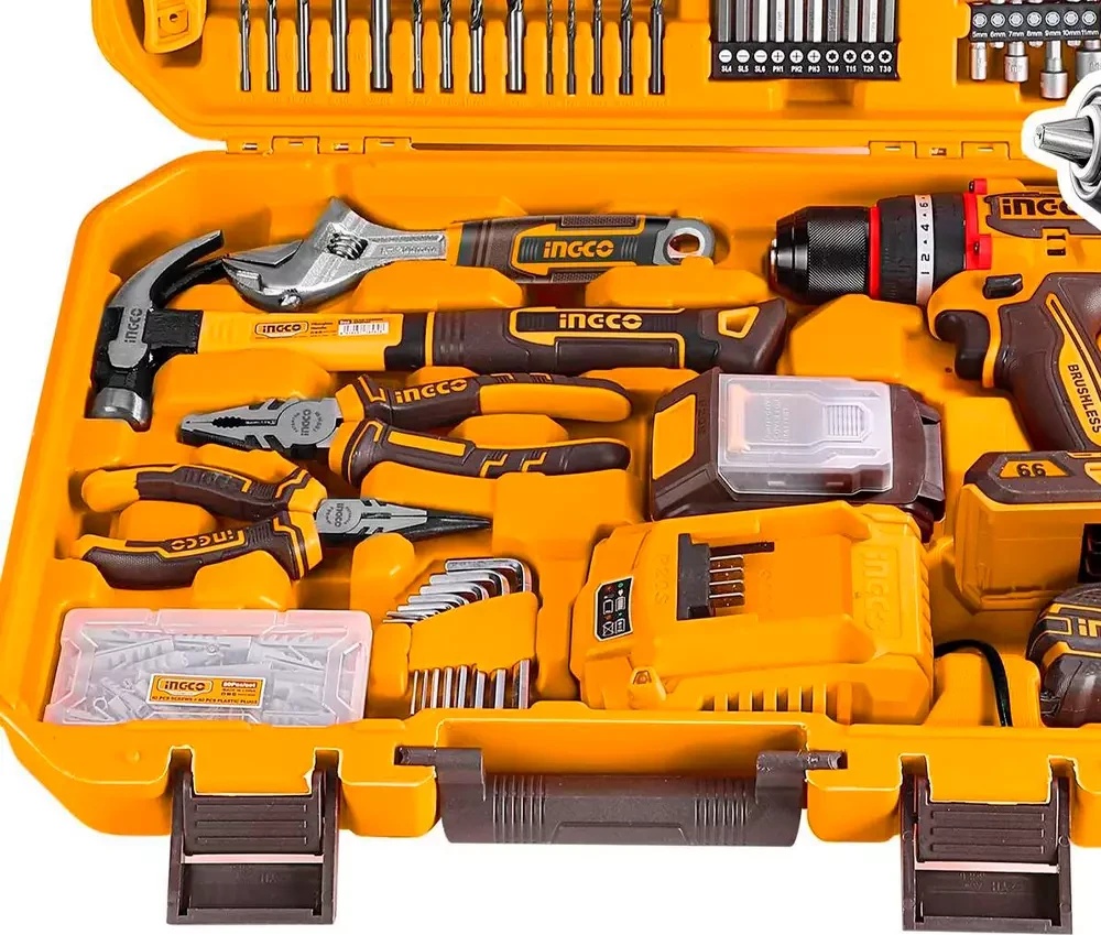Центральный элемент набора — бесщеточная ударная дрель-шуруповерт 20V. С мощным крутящим моментом 66 Нм и функцией удара она легко сверлит дерево, металл и кирпич. В дополнение к ней, набор включает полный арсенал ручных инструментов из хром-ванадиевой стали, от молотка и плоскогубцев до разводных ключей и десятков бит, гарантируя, что вы готовы к любой ситуации.