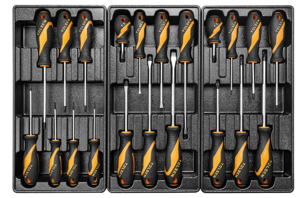 Материалы – инструментальные стали Cr-V, Cr-Mo, SNCM+V (S2), конструкционная сталь, хром, пластики PP, вспененный PVC, PP+TPR (рукояти отвёрток, трещоток, шарнирно-губцевого инструмента), дерево (рукоять молотка), PVC (ложементы)