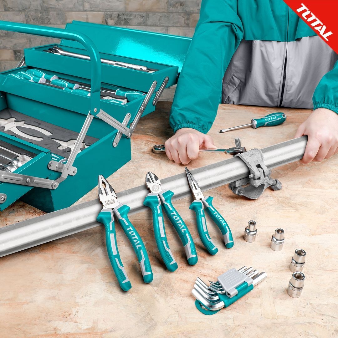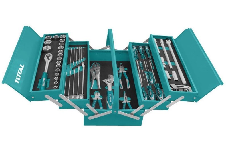 Набор инструментов TOTAL в металлическом ящике, 1/2", 59 предметов THTCS125910пригодится для выполнения ремонтных и монтажных работ. Изделия отличаются прочностью, выдерживают интенсивные нагрузки, удобны в использовании. Комплект поставляется в раскладном металлическом кейсе, обеспечивающем компактное аккуратное хранение и транспортировку инструментов.