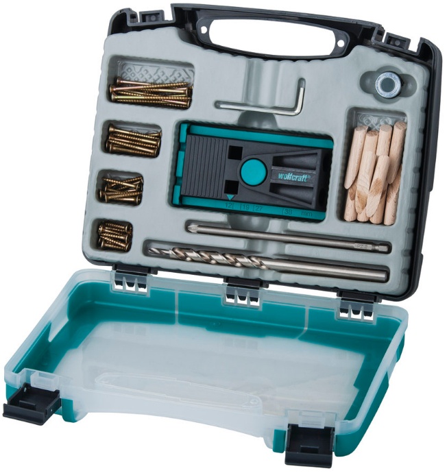Набор Undercover Jig от wolfcraft — это полный пакет, который содержит все необходимое для сверления и привинчивания скрытых деревянных соединений. С ним заготовки соединяются без особых усилий, точно и крепко всего за 3 этапа. Основным предметом данного набора является Undercover Jig — сверлильный шаблон для соединений косыми шурупами. Также в комплекте специальное сверло, ограничитель глубины, шестигранный ключ, шурупы с подходящей насадкой и заглушки для закрытия просверленных отверстий. С Undercover Jig выполняются точные косые высверленные отверстия, в которые затем вворачиваются шурупы для точного и крепкого соединения деревянных элементов. Ширина доски измеряется прямо на сверлильном шаблоне. Для всех ходовых толщин доски от 12 мм имеется практичная предустановка. В набор также входит ступенчатое сверло: его острие служит для наметки небольшого направляющего отверстия для резьбы шурупа, 2-я ступень выполняет в древесине большее отверстие под головку шурупа. В завершение этого деревянные элементы крепко соединяются шурупами. Наибольшим преимуществом по сравнению с обычным соединением является то, что у такого соединения не видны шурупы. Сходящие в набор заглушки для закрытия просверленных отверстий скрывают отверстия под шурупы. Точнее и проще соединить заготовки невозможно! Набор Undercover Jig идеален для производства мебели или ремонта обувных ящиков, цоколей стеллажей и шкафов.