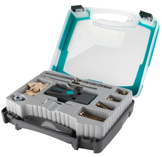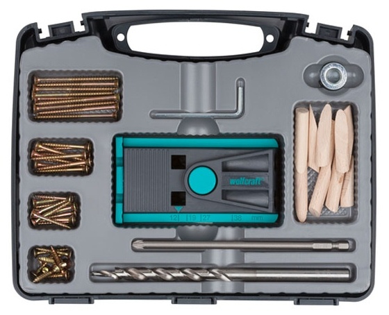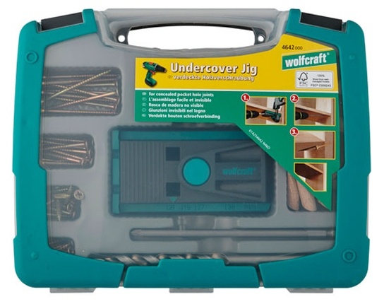 Набор Undercover Jig Wolfcraft (4642100) — это полный пакет, который содержит все необходимое для сверления и привинчивания скрытых деревянных соединений. С ним заготовки соединяются без особых усилий, точно и крепко всего за 3 этапа. Основным предметом данного набора является — сверлильный шаблон для соединений косыми шурупами. Также в комплекте специальное сверло, ограничитель глубины, шестигранный ключ, шурупы с подходящей насадкой и заглушки для закрытия просверленных отверстий.