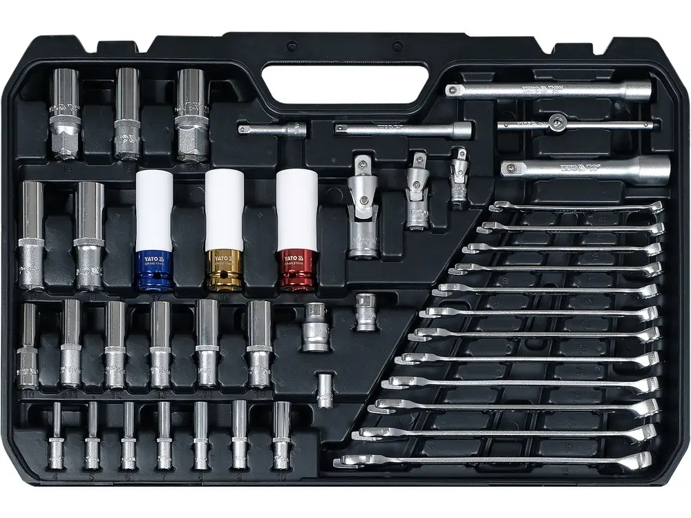 Профессиональный набор инструментов для ремонта авто YATO YT-38850 на 198 предметов разработан для удовлетворения потребностей специализированных автомобильных и авто сервисов. Данный комплект позволяет выполнять множество работ по техническому обслуживанию, связанных с ослаблением и затягиванием резьбовых соединений различных размеров, которые требуют высоких нагрузок и точности.