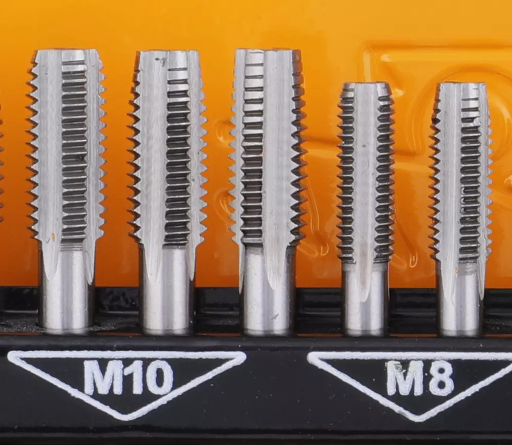 Наборы метчиков DIN 352 для метрической M резьбы состоят из трех метчиков -первый (черновой метчик) маркирован одним кольцом, длинная заборная часть, Форма А / 6-8 витков. Средний (получистовой) маркирован двумя кольцами, средняя заборная часть, Форма D / 3,5-5 витков. Третий (чистовой) без маркировки, короткая заборная часть, Форма С / 2-3 витка.