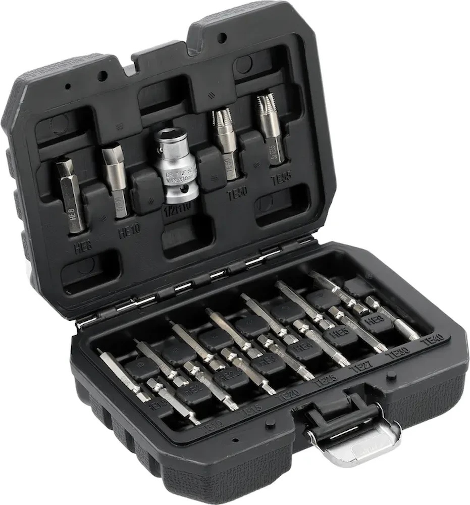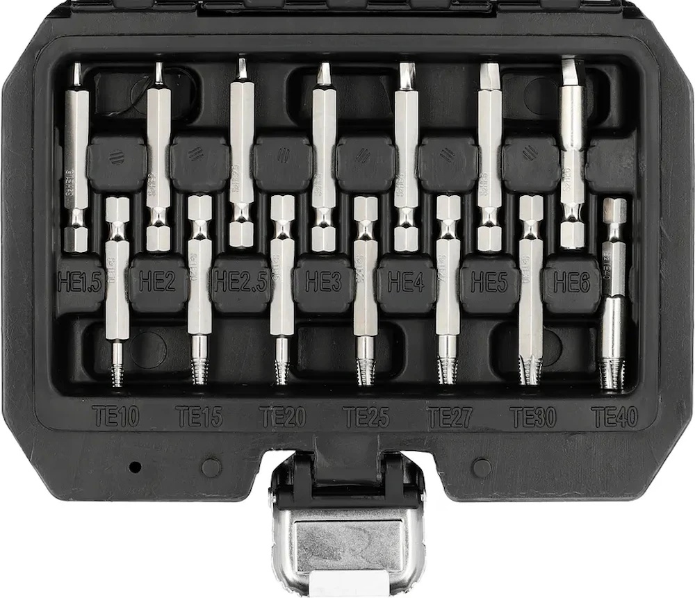 Набор включает 19 предметов, предлагая разнообразие размеров, чтобы удовлетворить ваши разные потребности. Размеры захвата варьируются от 1/4" до 3/8", что обеспечивает гибкость и адаптивность в зависимости от требований вашего проекта. Модели HEX и TORX позволяют эффективно работать с широким спектром винтов и гаек.