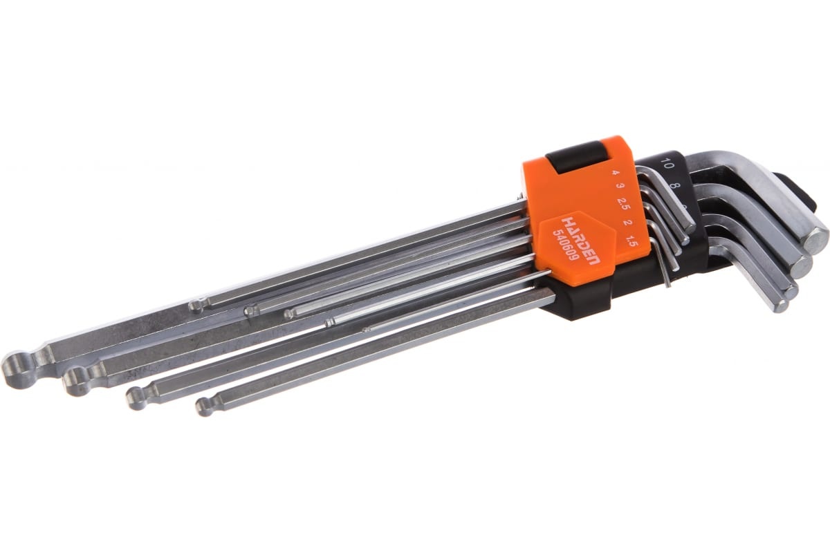 Набор имбусовых ключей HARDEN HEX, с шарообразной головкой, 23 см, CRV, 9 шт. 540609 предназначен для обслуживания шестигранного крепежа. Каждый ключ изготовлен из Cr-V стали и отличается высокой стойкостью к износу. Антикоррозийное покрытие обеспечивает надежную защиту инструмента от негативных внешних воздействий. Это значительно продлевает срок службы.