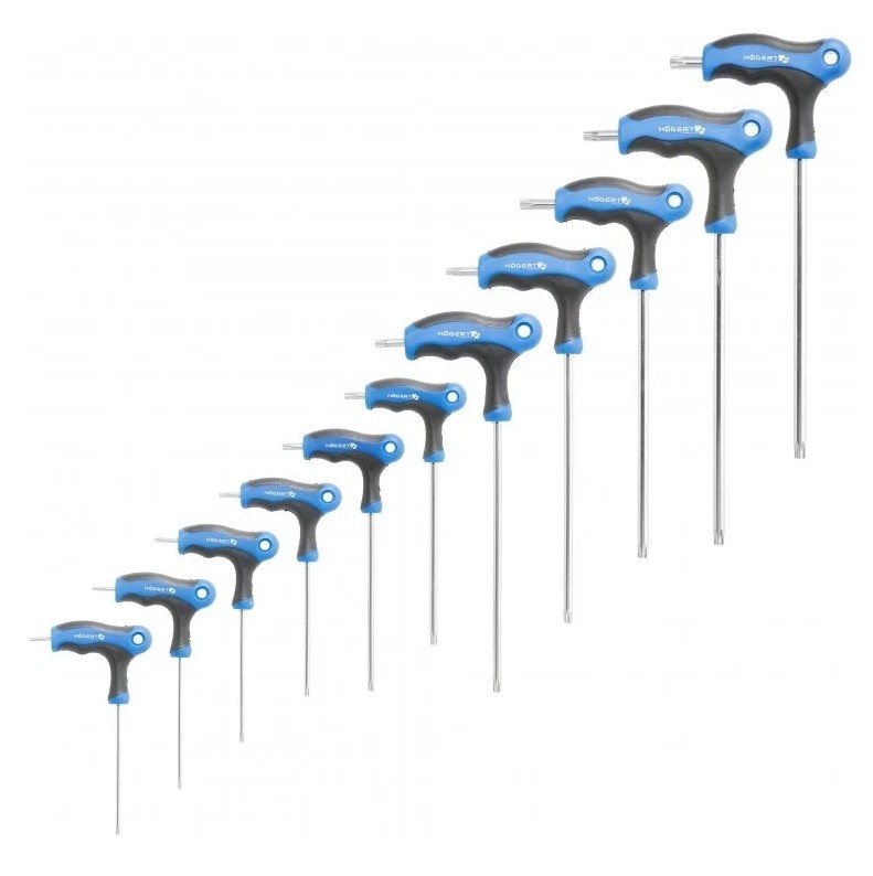 Набор из 10 предметов прецизионных длинных ключей torx, изготовленных из высококачественной легированной стали S2, гарантирующей максимальную прочность и устойчивость к деформации и скручиванию. Использование рукоятки типа "Т" повышает удобство использования и обеспечивает надежный захват. Они идеально подходят для откручивания и закручивания винтов в ограниченном пространстве. Незаменим в мастерской и при проведении строительных/ремонтных работ, а также в каждом доме.