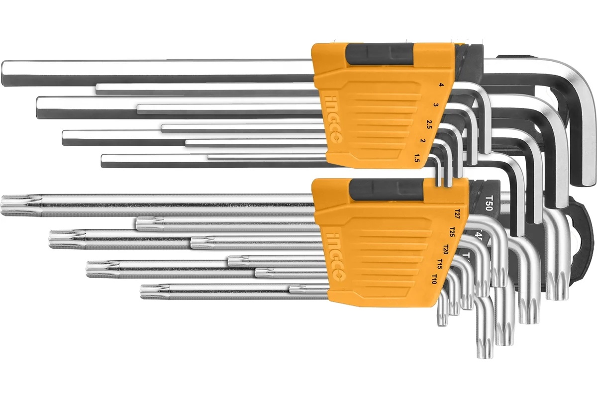 Набор шестигранных ключей INGCO 18 шт. HEX1,5-10мм, TORX Т10-Т50 INDUSTRIAL HHKSET0181 служит для монтажа и демонтажа крепежа с внутренним шестигранным или звездообразным (Torx) шлицем.