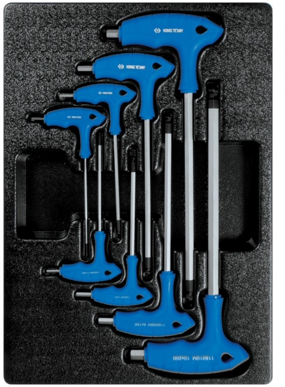 Изготовлены в L-образной форме. Эргономичная форма рукояток, изготовленных из пластика, удобна при удержании инструмента в процессе работы. В процессе производства рабочие поверхности шестигранников KING TONY подвергаются специальной термической обработке, что придаёт им особую прочность и стойкость к износу или сколам. Материал ложемента – ПВХ (поливинилхлорид). Изготовлен специально для комплектации инструментальной тележки.