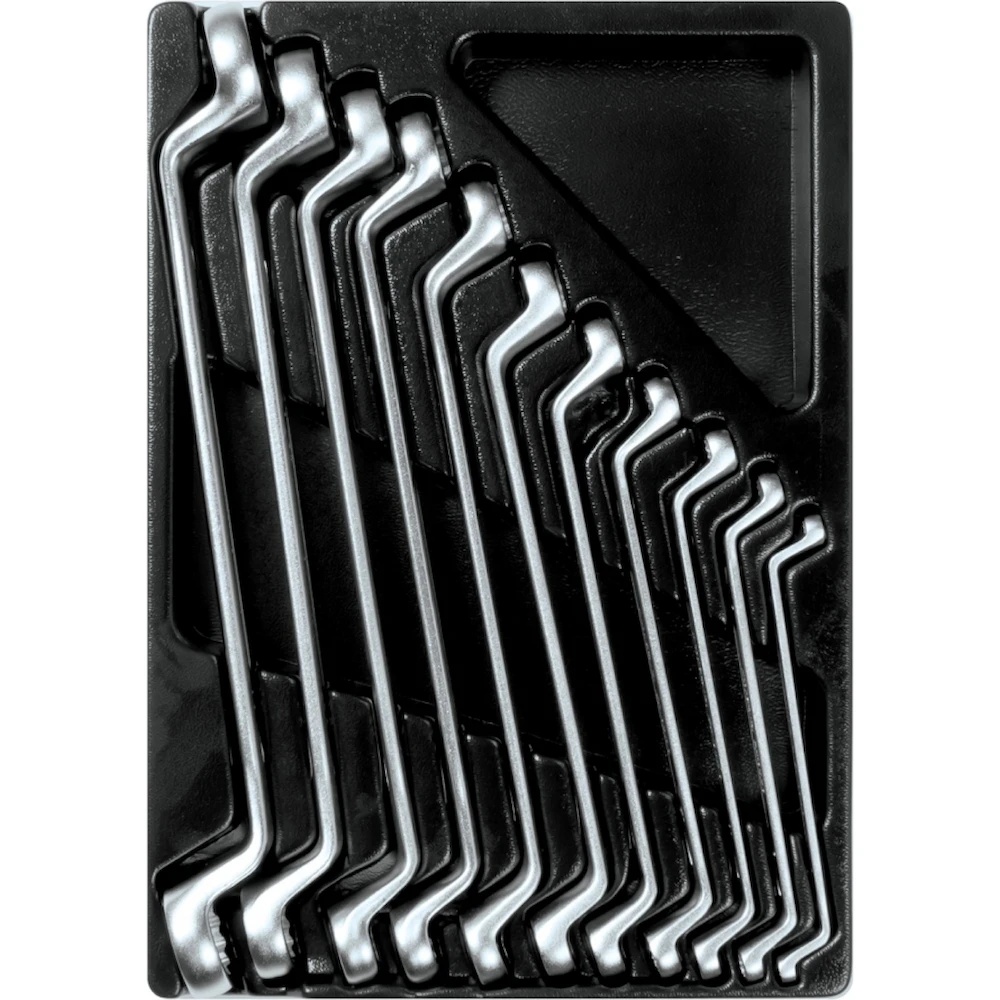 Геометрия ключей позволяет применять их при работе с крепежом, находящимся в углублении либо в ограниченном пространстве. На ключи накидные KING TONY распространяется пожизненная гарантия, что даёт возможность применения их в профессиональных целях. Материал ложемента – ПВХ (поливинилхлорид). Изготовлен специально для комплектации инструментальной тележки.