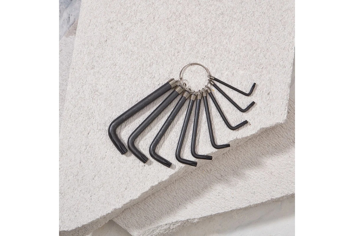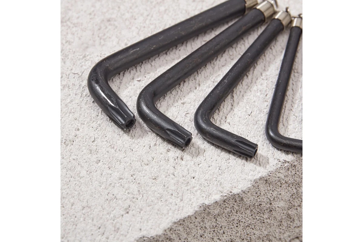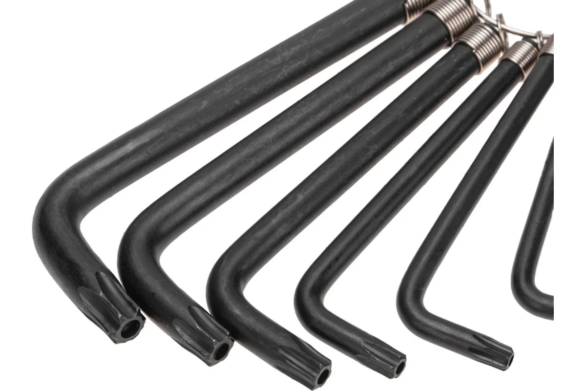 Набор имбусовых ключей TORX KRANZ T10-T50, 9 шт., представляет собой комплект Г-образных инструментов, предназначенных для работы с крепежом, оснащённым шлицом TORX (звёздочка). Ключи изготовлены из хромованадиевой стали (CrV), что обеспечивает высокую прочность и устойчивость к коррозии благодаря оксидированному покрытию. Твердость рабочей части составляет 45 HRc, что гарантирует долговечность при работе с крепежом повышенной прочности.