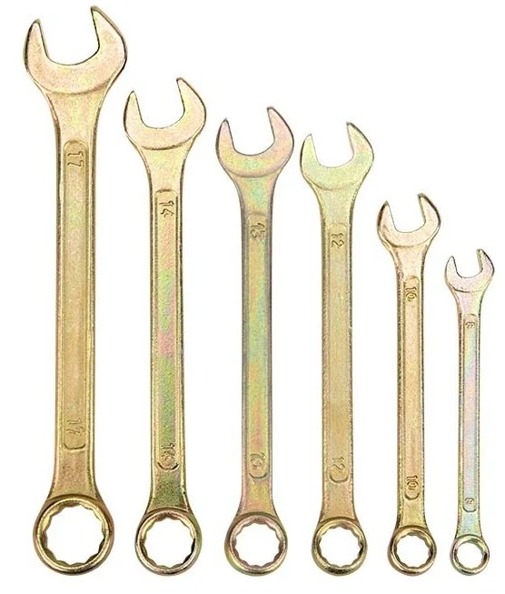 Набор комбинированных ключей REXANT 8-17 мм, 6 шт желтый цинк 12-5841-2 применяется для монтажа и демонтажа резьбовых соединений, таких как гайки и болты.