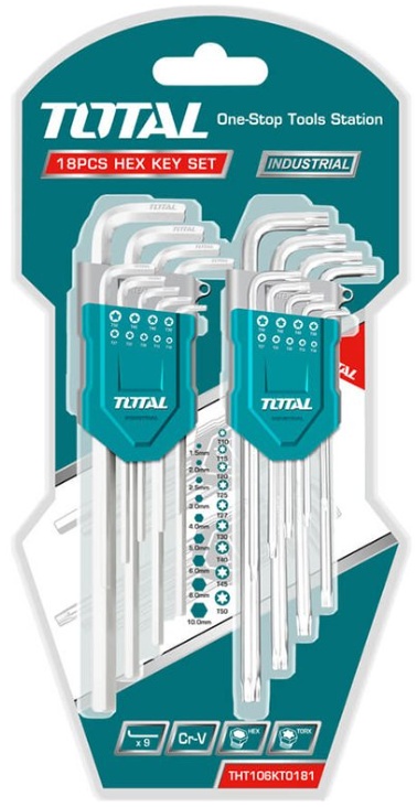 Ключи шестигранные набор 18шт. THT106KT0181 — изготовлены из прочной стали, обеспечивающей долгий срок службы инструмента. Удобная пластмассовая упаковка с отделениями для каждого ключа облегчает их хранение.