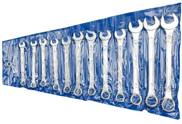 Набор комбинированных ключей 51620 состоит из 12 ключей, выполненных из инструментальной стали и предназначенных для монтажных (демонтажных) работ. Их применяют в строительстве, в автомастерских, в быту. Ключи сочетают в себе рожковый и накидной ключи размером от 6 до 22 мм.