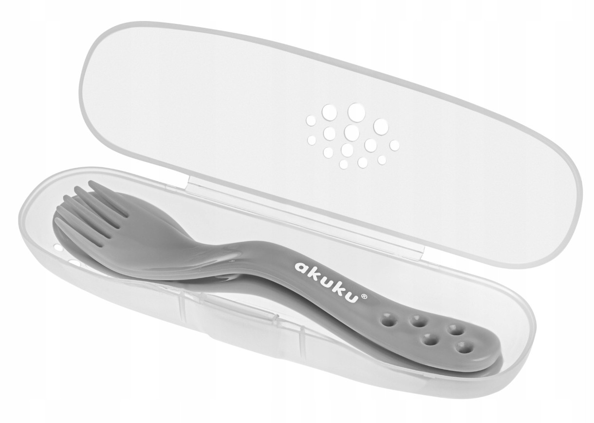 Набор фигурных столовых приборов: вилка и ложка. Оснащены практичным футляром, благодаря которому могут быть использованы вне дома - на прогулках и в дороге. Изготовлен из безопасных высококачественных материалов, предназначенных для контакта с пищевыми продуктами. Округлые формы столовых приборов подходят для нежных десен маленького ребенка. Продукт полностью не содержит бисфенола А (0 BPA).
