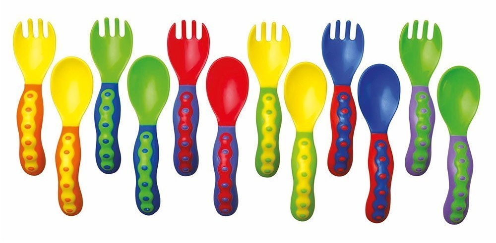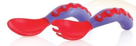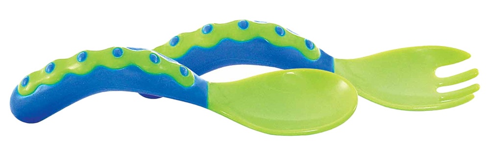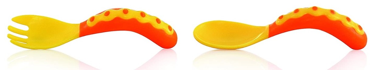 Набор Nuby состоит из ложки и вилки анатомической формы с закруглёнными краями. Специально разработанная изогнутая форма подходит для маленьких ладошек, дети с удовольствием и интересом предпринимают попытки держать их самостоятельно. Их легко держать как правой рукой, так и левой.