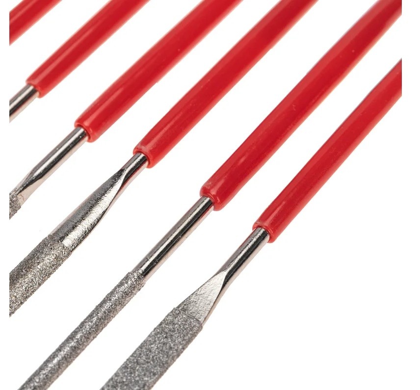 - Набор комплектуется десятью надфилями с напылением из алмазной крошки, которые применяются для мелких слесарных работ с особо твердыми материалами: металлом, керамической плиткой, стеклом и др.