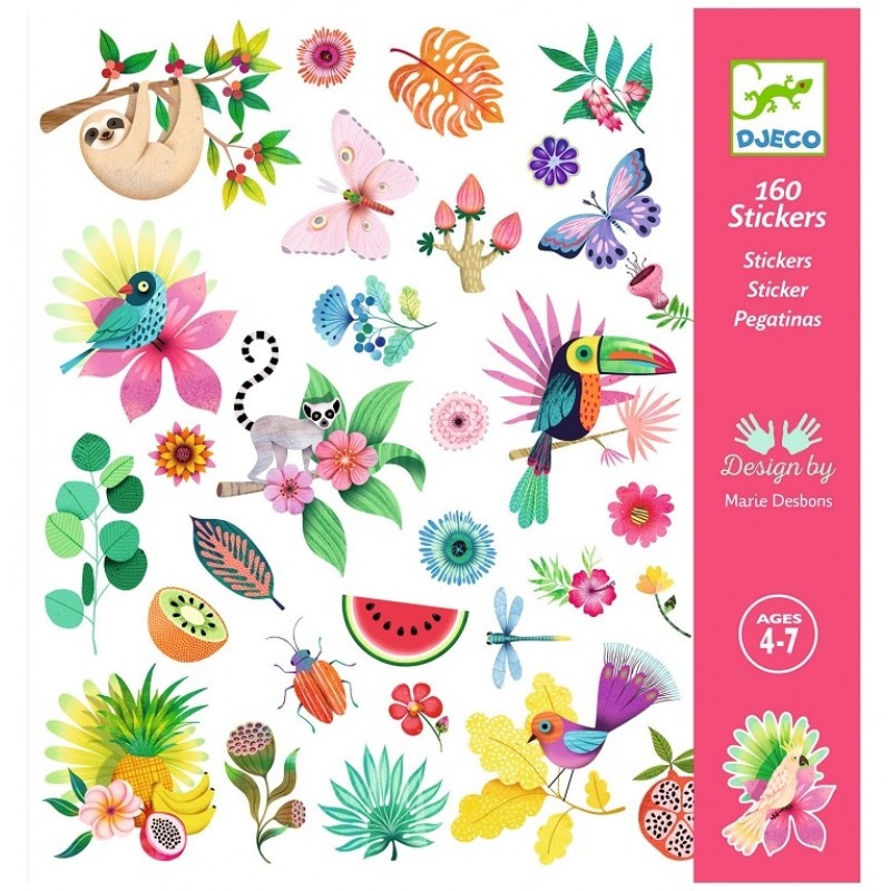 В наборе от французской компании Djeco 160 красочных, красиво оформленных тематических наклеек. Основная тема набора — райские растения и дикие животные. Наклейками можно украсить тетради или блокноты девочек или использовать для наклеивания иллюстраций и картинок.