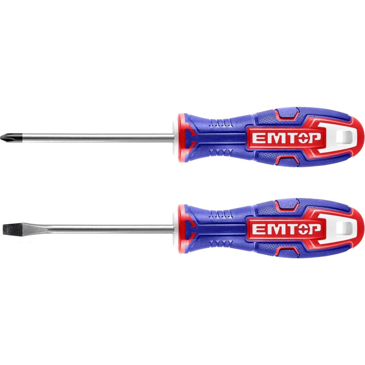 EMTOP ESST0202 — это набор отвёрток, который станет незаменимым помощником в любом домашнем или профессиональном ремонте. SL6.5, а другая — с крестообразным PH2. Эти инструменты позволят вам легко справляться с различными задачами, от сборки мебели до мелкого ремонта электроники. Ручки отвёрток выполнены из двухкомпонентного материала, что обеспечивает удобный и надёжный хват.