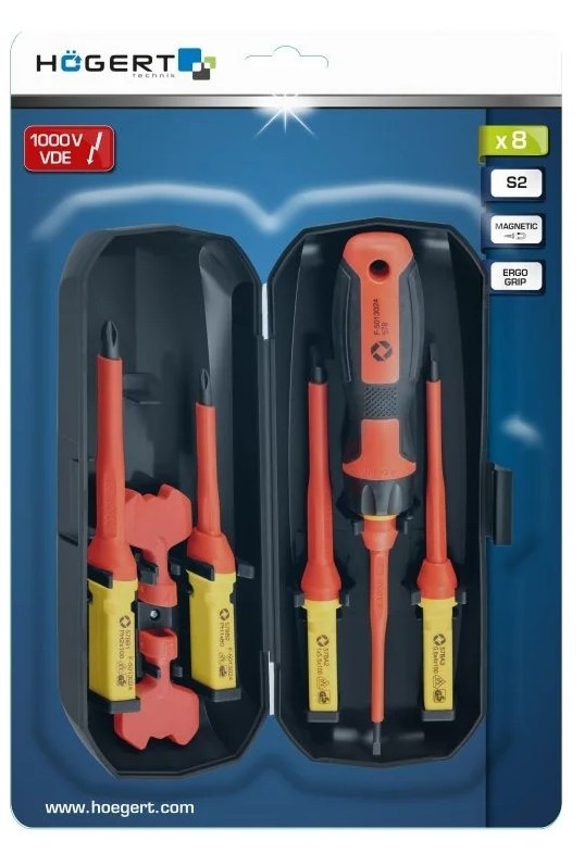 Набор отверток в исполнении VDE сертифицирован для работы под напряжением до 1000 В. Удобная изолированная рукоятка с системой быстрой смены бит в комплекте с 5 рабочими битами и 2 ключами для распределительных шкафов, упакованы в практичный чехол. Необходим каждому профессионалу.