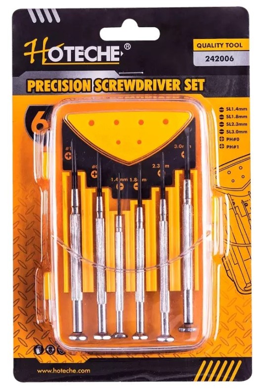 Набор отвёрток для точных работ HOTECHE 242006. – состоит из 6 предметов с разными рабочими профилями - крестовым и плоским. Отвертки имеют специальную конструкцию для удобства управления. Изделия предназначены для выполнения сборочно-демонтажных работ в точной механике. Каждая отвертка имеет продольные ребра на ручке, что снижает риск проскальзывания инструмента во время работы. Для защиты от износа и появления коррозии отвертки имеют никелированные рукоятки.