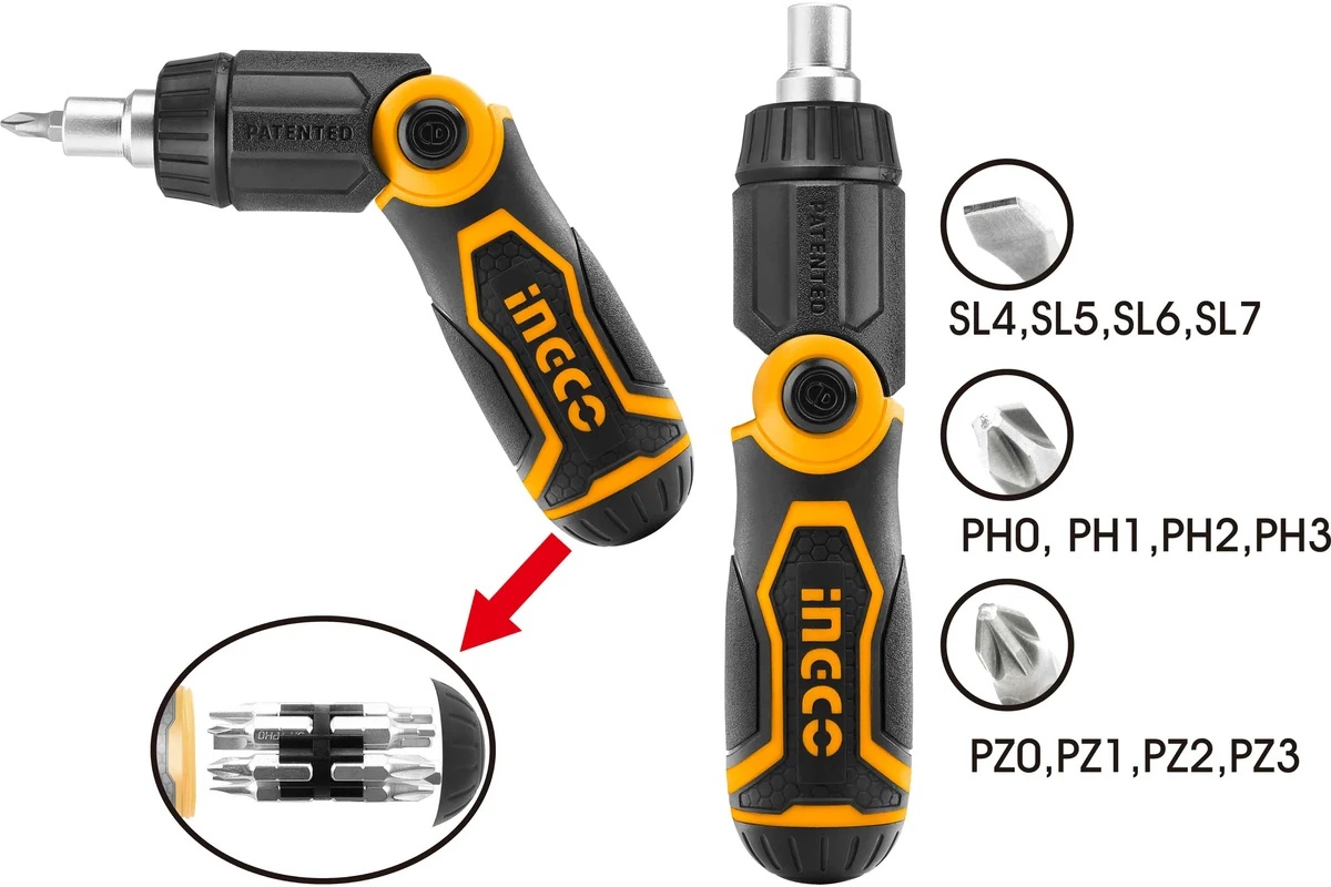 • Отвертка оснащена трещоткой с наклоном влево и вправо.