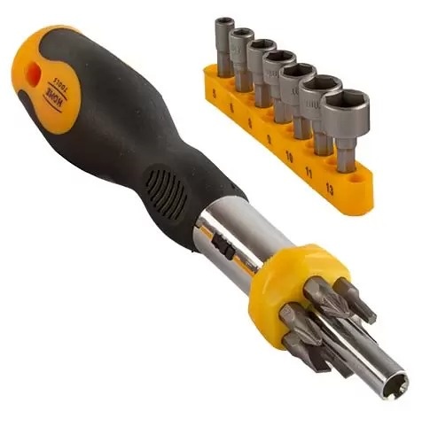 Отвертка с трещоткой и насадками SL 4-5x25, PH1-2x25, PZ1-2x25, TX15-20x25, Hex 5-6x25 этот комплект инструментов является многофункциональным решением для выполнения широкого спектра работ. Отвертка с трещоткой позволяет с легкостью затягивать и ослаблять крепеж, сокращая время на выполнение работ и уменьшая усталость. Насадки изготовлены из высококачественной стали, что обеспечивает их долговечность и надежность.