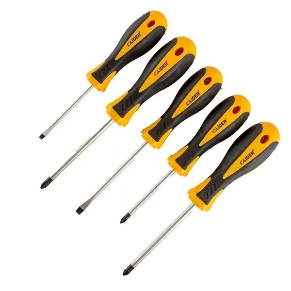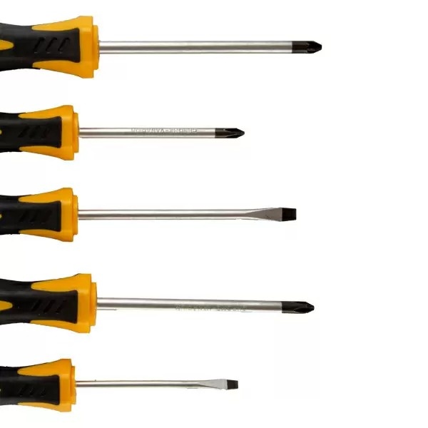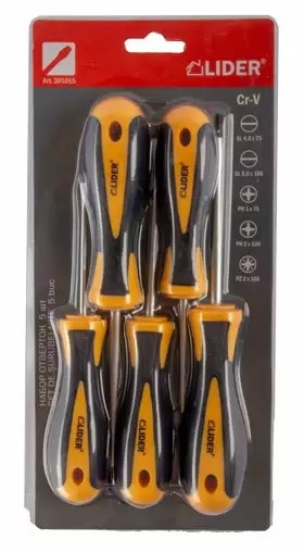 Набор отверток 5 шт., прорезиненная ручка SL4,0x75, 5,0x100, PH1x75, 2x100, PZ2x100 - Этот набор включает в себя пять отверток, предназначенных для выполнения различных видов работ, от бытового ремонта до профессионального использования. Отвертки оборудованы прорезиненными ручками для обеспечения удобного и надежного захвата, что снижает риск скольжения во время работы. Набор состоит из отверток с плоскими (SL) и крестообразными (PH, PZ) наконечниками различных размеров, что делает его универсальным решением для множества задач.