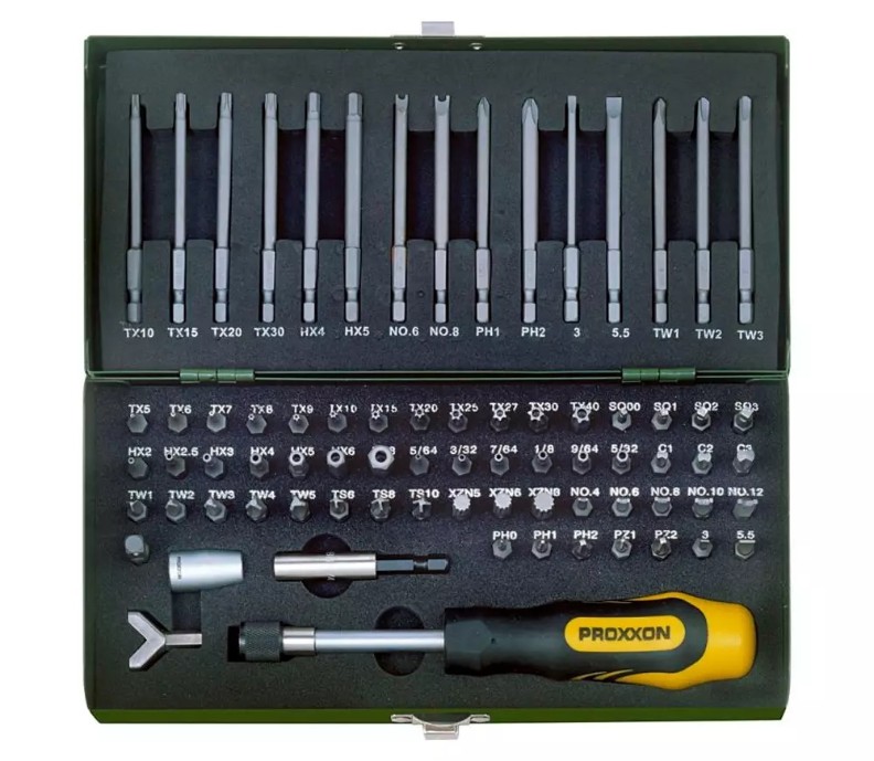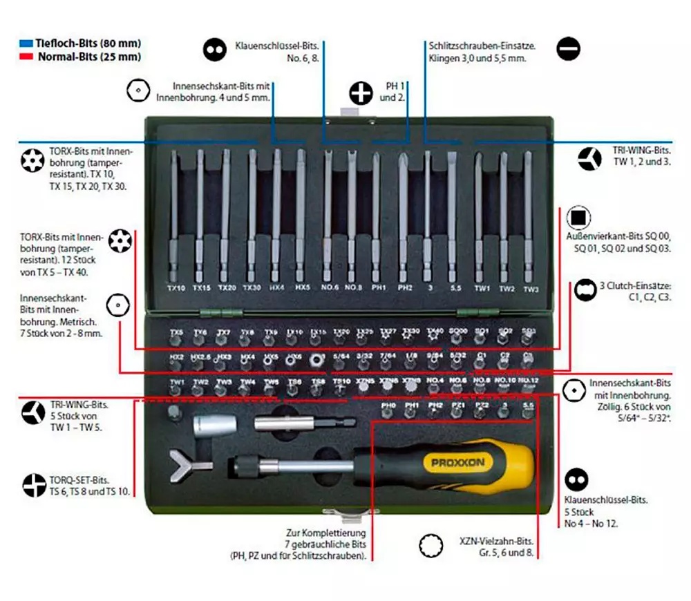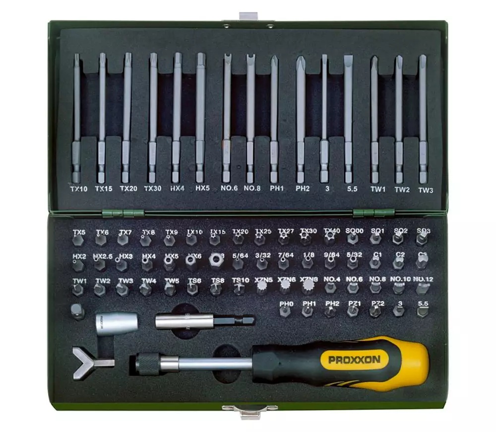 Набор специальных бит 23107 фирмы Proxxon - универсальный комплект инструментов и насадок для работы с крепежом различной конфигурации.
